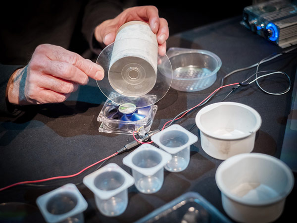 Verschiedene Plastikverpackungen (Joghurtbecher, Pralinenschachteln) werden mit einer Ecke auf der sich drehenden, flachen Mittelfläche der Computer-Lüfter gehalten, so dass komplexe Schleifgeräusche oder Reibeklänge entstehen. Diese Klänge werden zusätzlich mit akustischen Resonatoren (Pappbecher, Blechdosen) moduliert. An einigen Stellen gibt es eine Zuspielung aus verschiedenen Sinustönen und voraufgenommenen, teilweise bearbeiteten Reibeklängen.