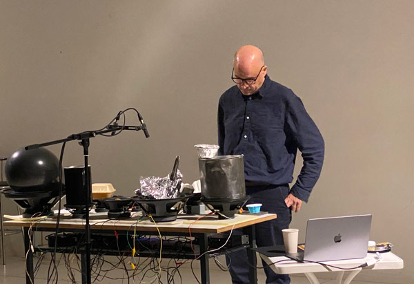 Komposition für 8 vibrierende Lautsprechermembrane, mitschwingende Objekte und Sinustöne, 21:12 min, 2024.